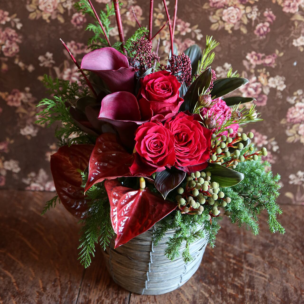 赤バラをメインにカラーやアンスリュームと合わせたアレンジ。