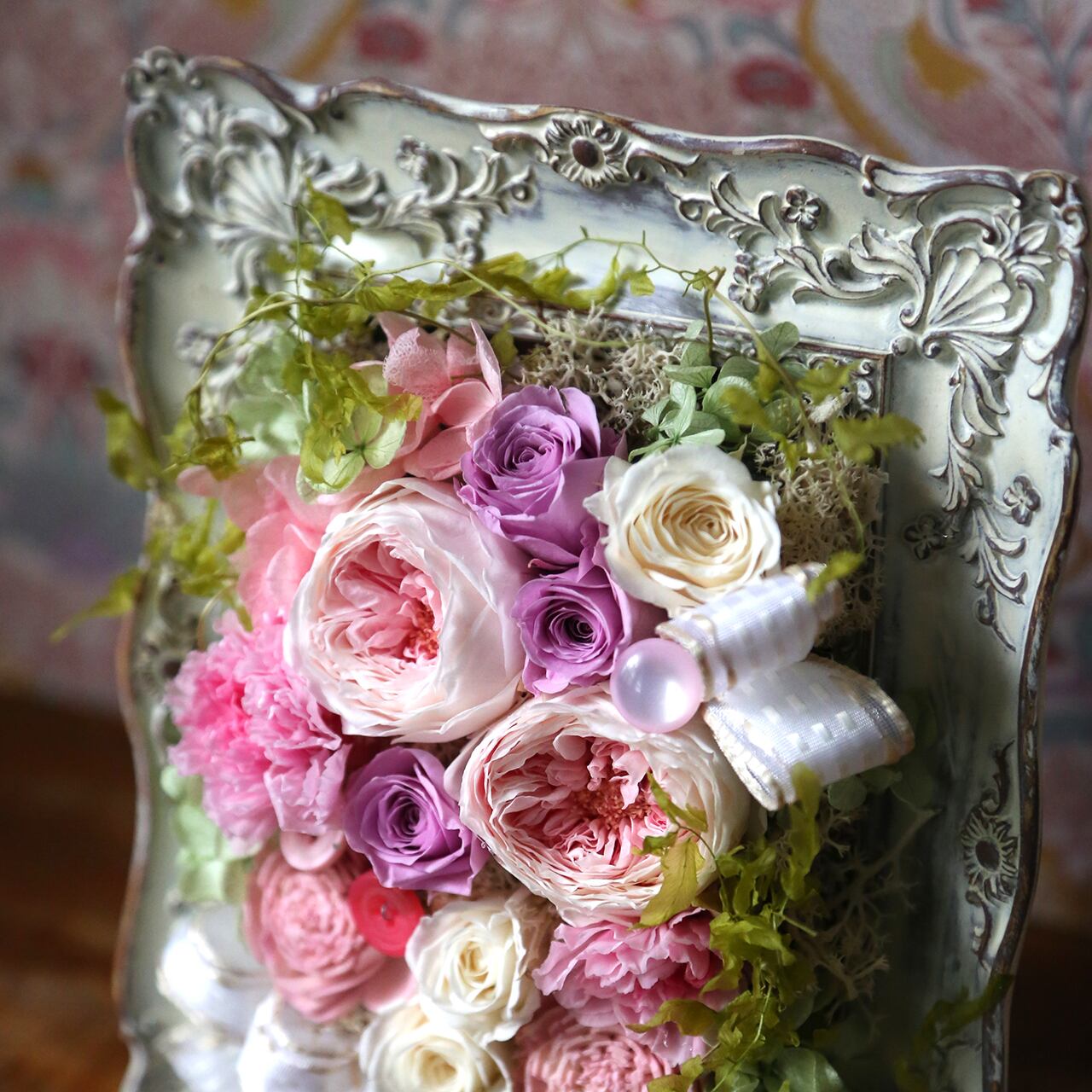 フォトフレームにアレンジしています。写真立てを飾っている場所に一緒に飾ると可愛いアクセントになります。