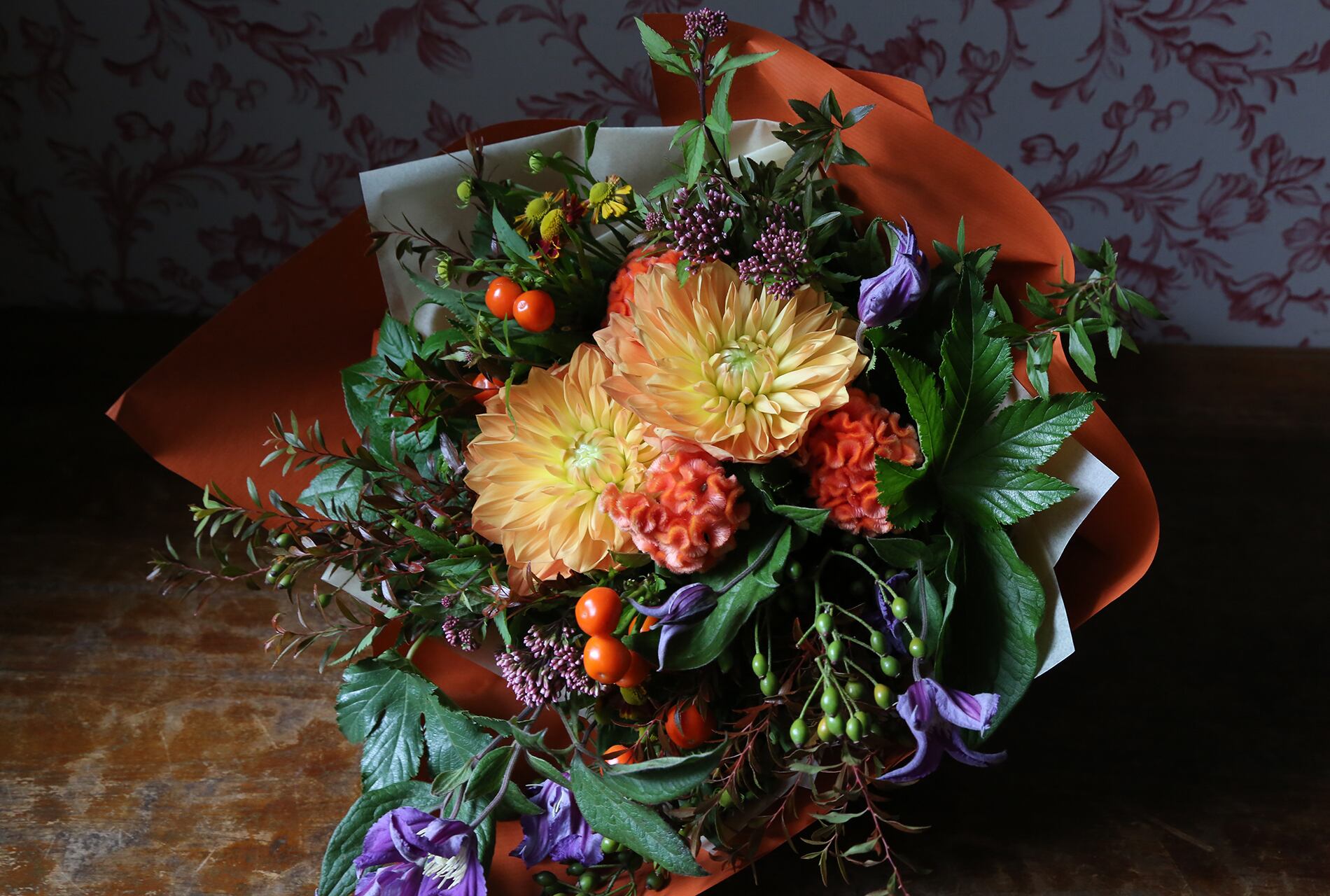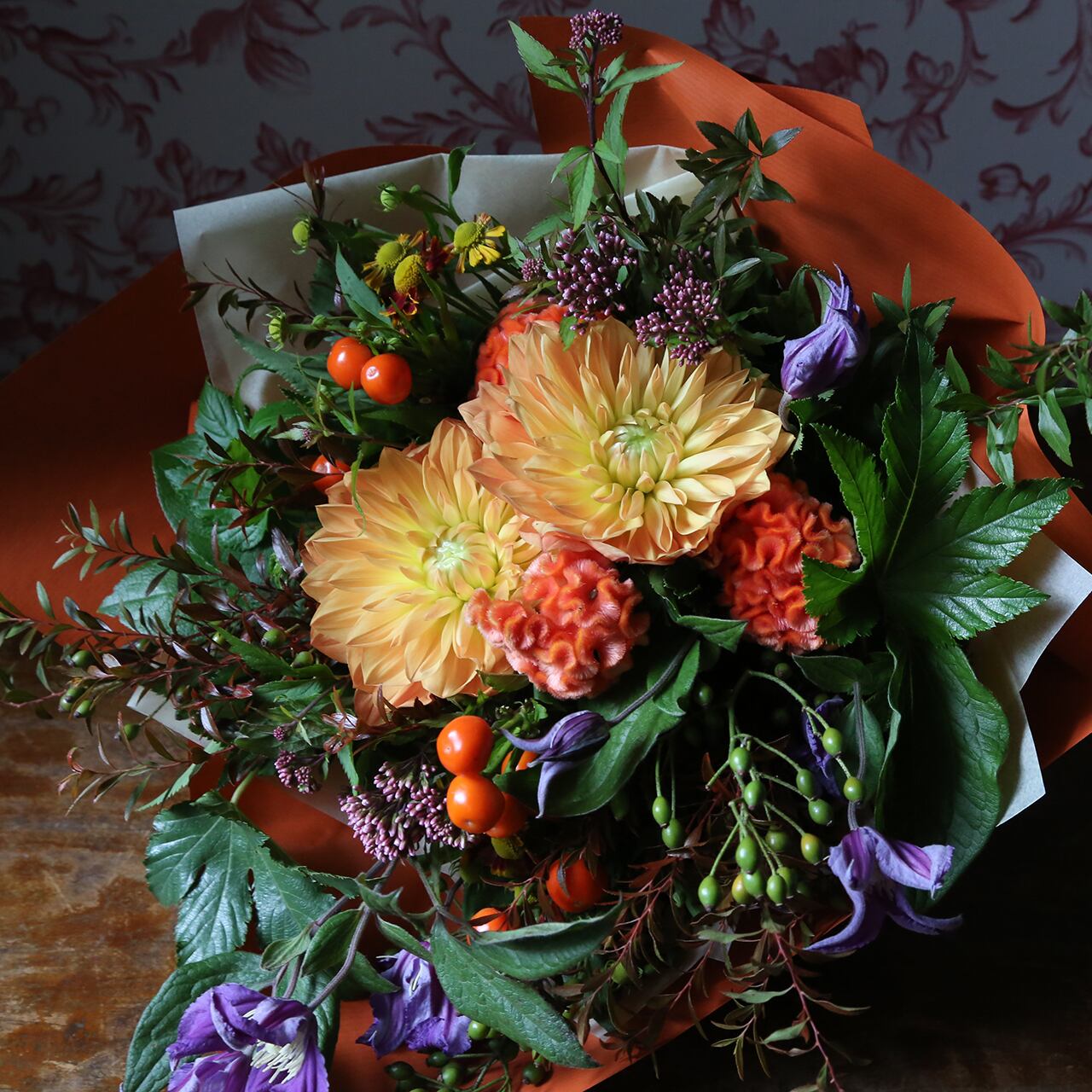 秋咲ダリアと秋の実物の花束